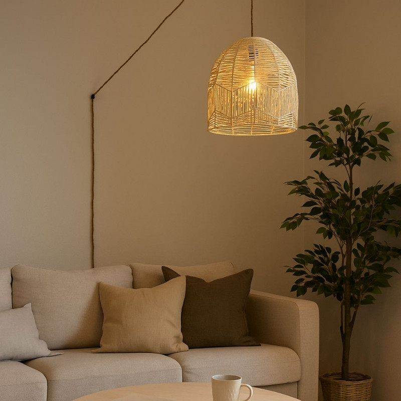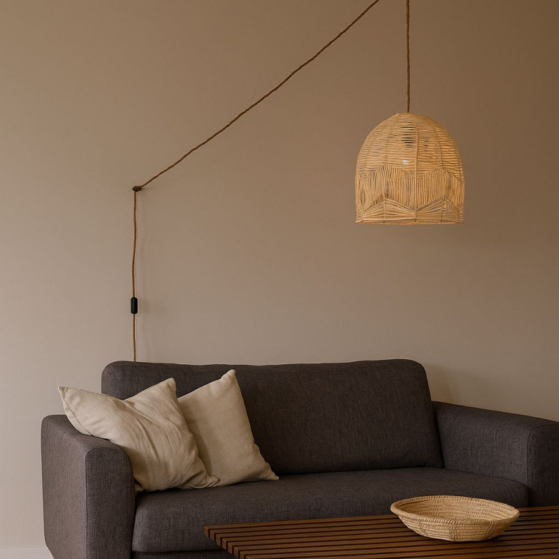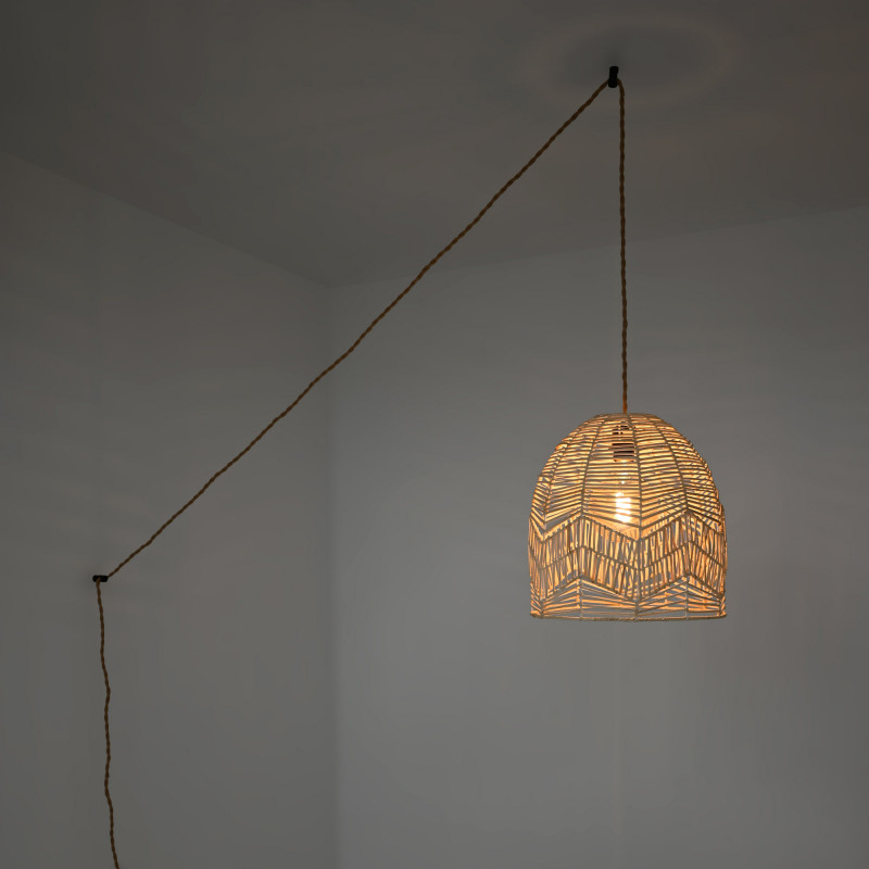 • Instalación flexible: Incluye cable regulable con dos ganchos descentralizadores para distintas configuraciones. Incorpora interruptor y enchufe Schuko, ideal para espacios sin punto de luz cercano. Disponible en negro, blanco y cuerda natural.