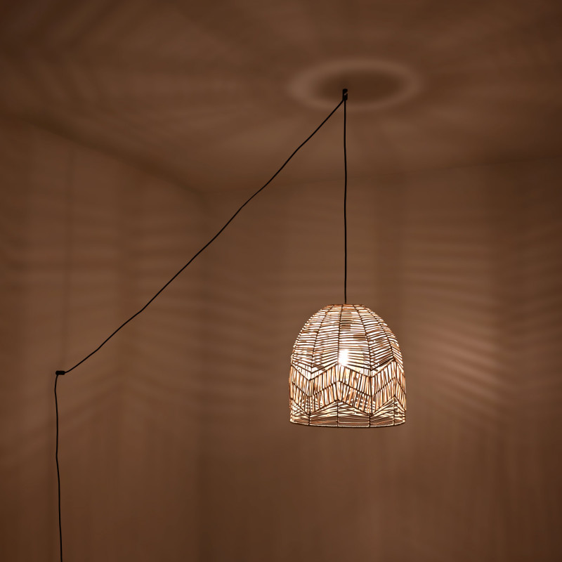 Lámpara colgante "NORMA", elaborada artesanalmente en mimbre con acabados de alta calidad. Su entramado difunde la luz de forma cálida y sutil, realzando su textura.