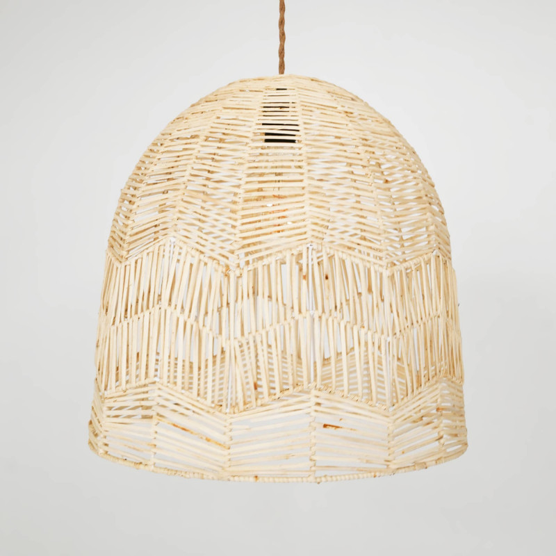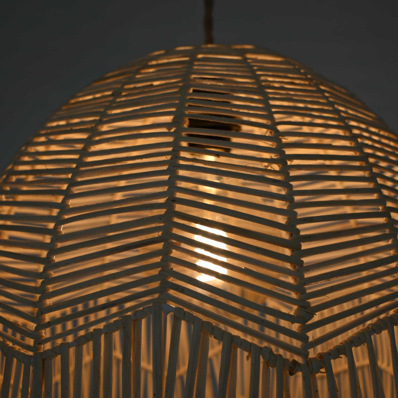 Lámpara colgante "NORMA", elaborada artesanalmente en mimbre con acabados de alta calidad. Su entramado difunde la luz de forma cálida y sutil, realzando su textura.