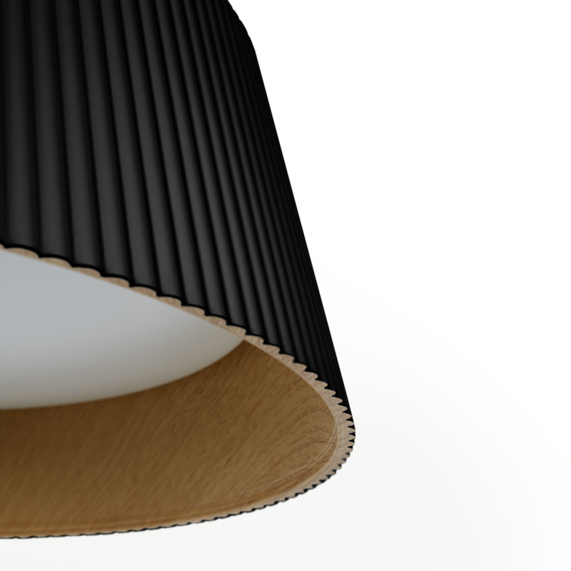 Esta luminaria de techo, disponible en acabados blanco o negro, presenta un diseño único que combina el policarbonato con un interior en tono madera y un difusor central de policarbonato.