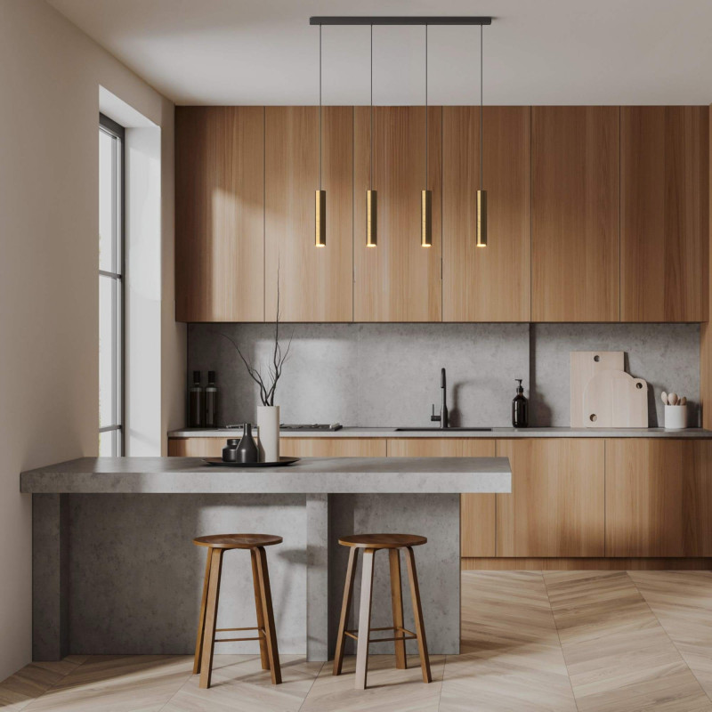 Esta lámpara se compone de 4 focos tubulares y cuenta con un diseño moderno y minimalista. Proporciona una iluminación focalizada perfecta para áreas específicas como mesas, barras y cocinas.