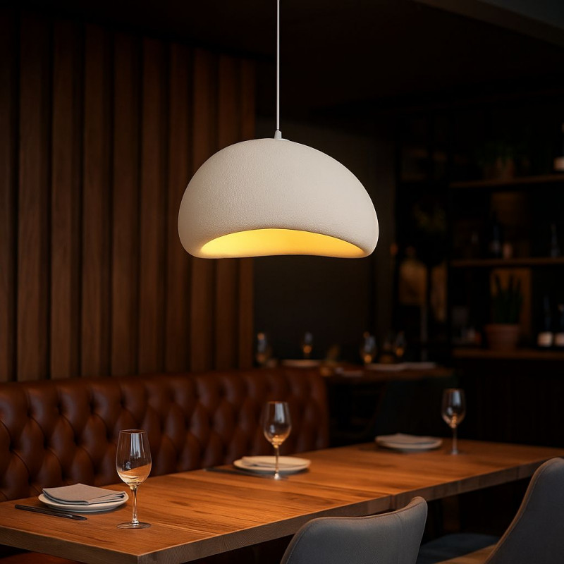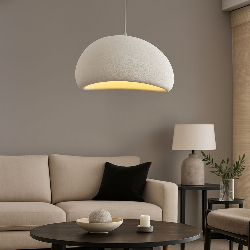Lámpara colgante fabricada en resina con acabado texturado. Su diseño artesanal y tonos neutros aportan calma y armonía visual a cualquier ambiente.