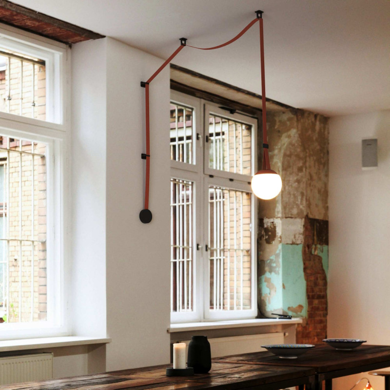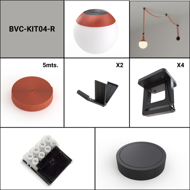 - KIT completo: Incluye una lámpara bola en policarbonato opal de diseño minimalista + correa textil conductora de 5 metros en color ladrillo + accesorios de instalación.