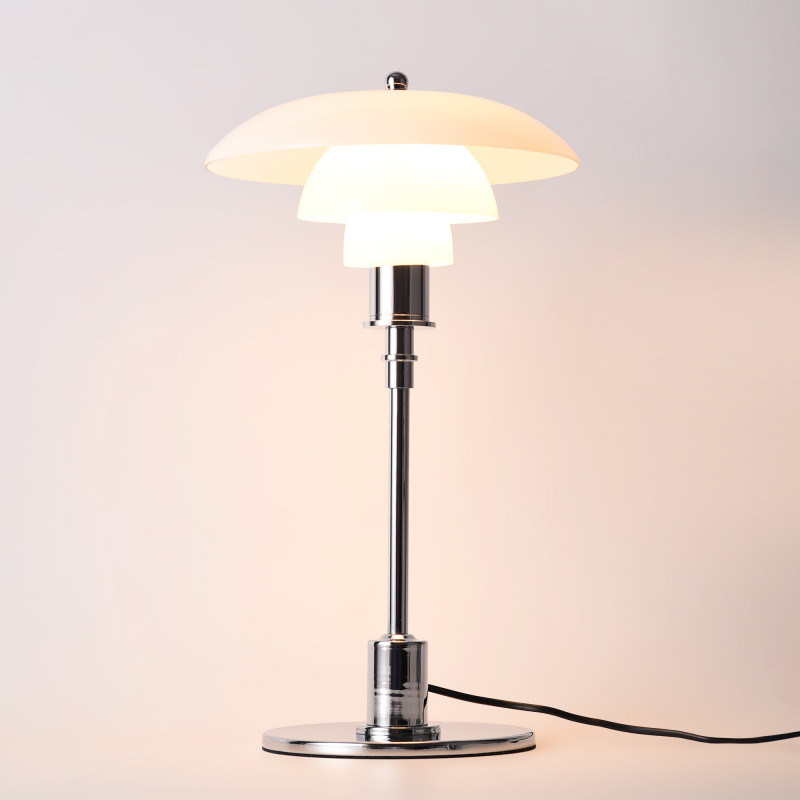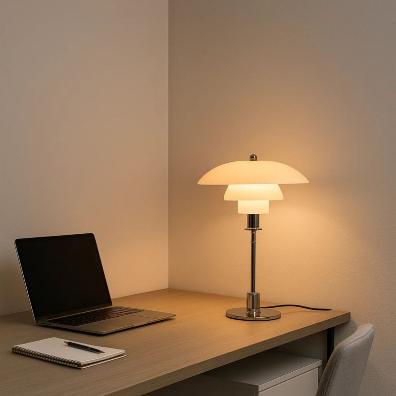 Su diseño se basa en un sistema de tres pantallas reflectantes que dirigen la luz hacia abajo. Las pantallas son de cristal opalino y están ubicadas entre sí a una distancia precisa para ofrecer una iluminación suave y difusa, libre de deslumbramientos.