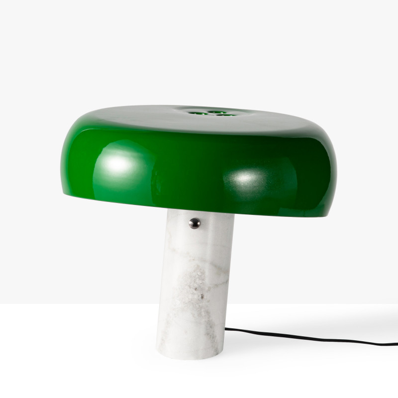 Lámpara de mesa de diseño de tamaño mediano, con una elegante combinación de pantalla en metal y base de mármol blanco.