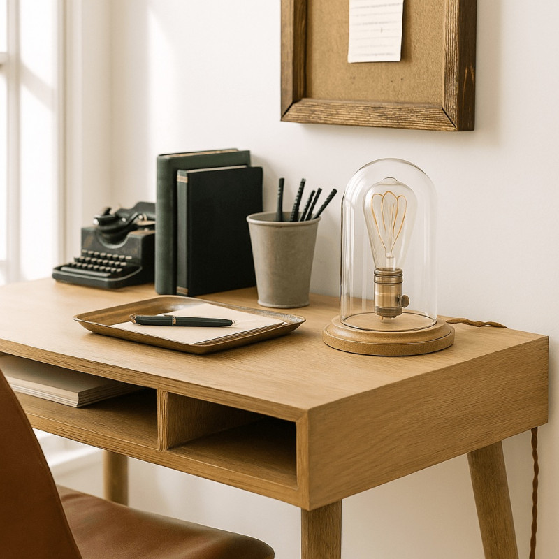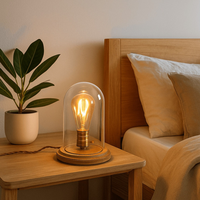 La lámpara de mesa Tule combina una estética inspirada en La Bella y la Bestia con materiales cálidos y elegantes. Su cúpula de cristal y base de madera realzan cualquier espacio interior.