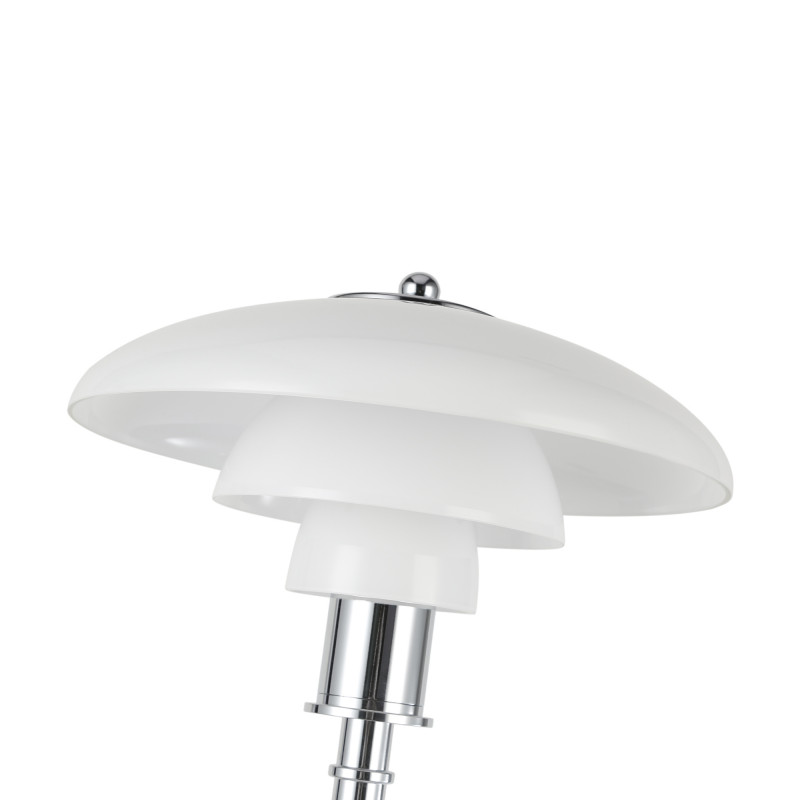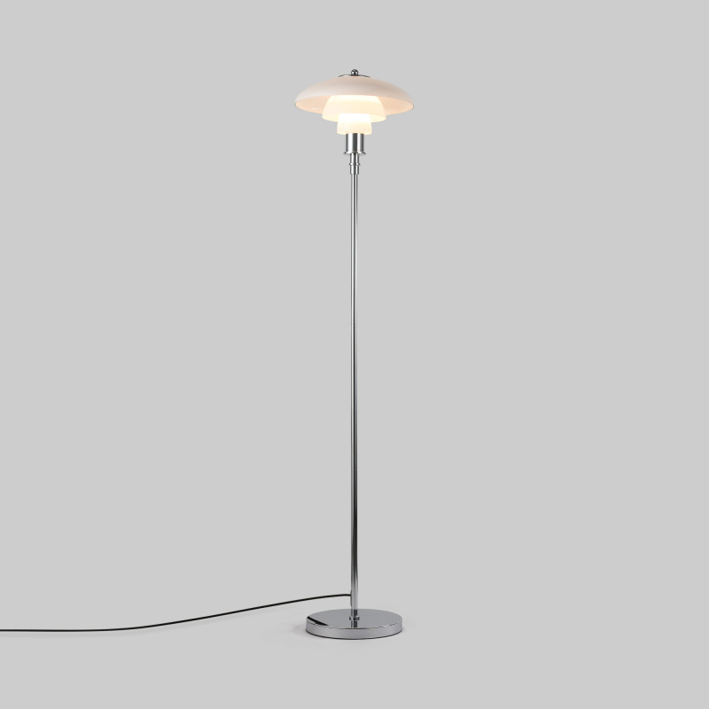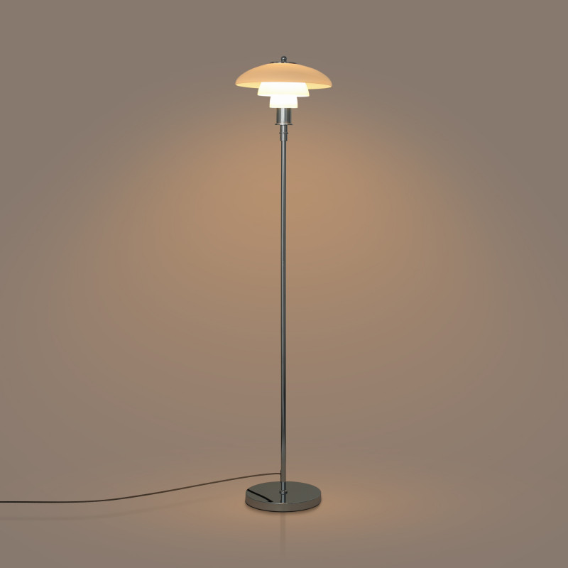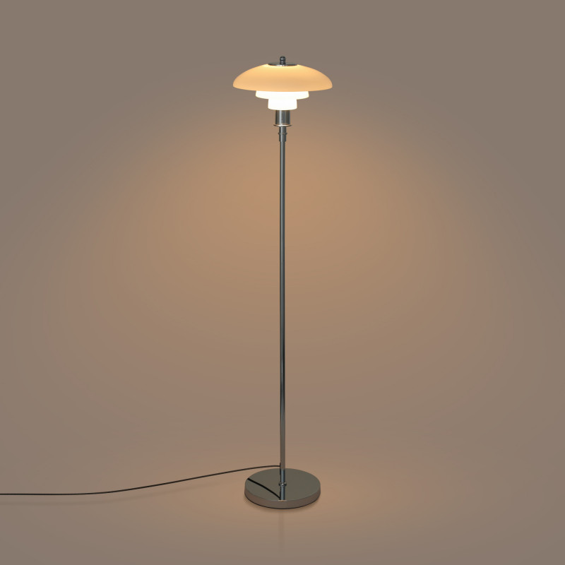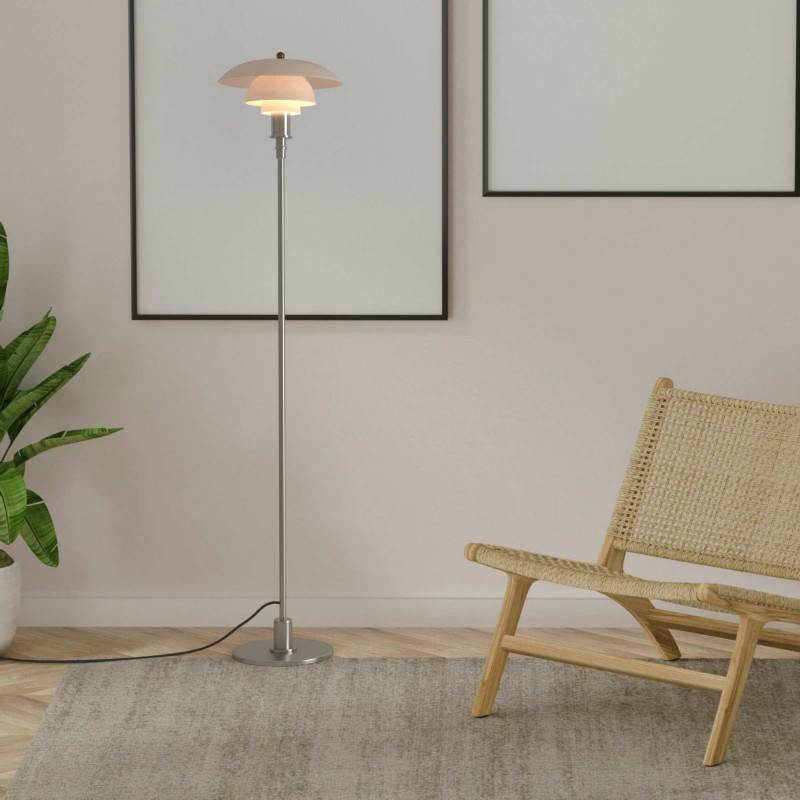 Lámpara de pie de diseño exquisito con triple pantalla de cristal opal y detalles en aluminio, con acabado dorado y cromo.