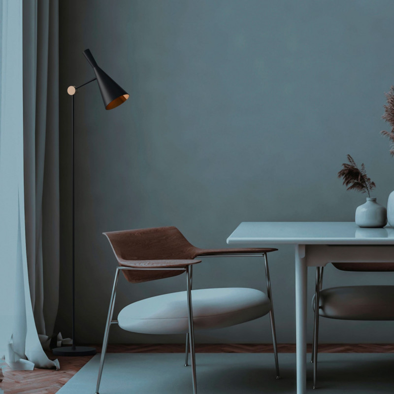 La lámpara de pie "Olivia" cuenta con un diseño contemporáneo y una estructura de aluminio disponible en color negro, blanco y dorado satinado.