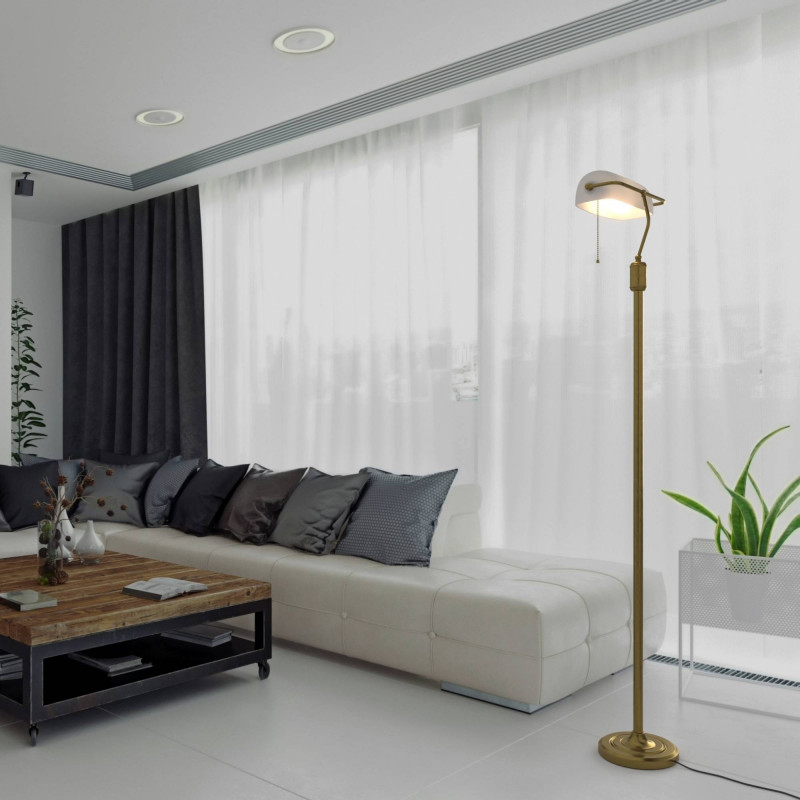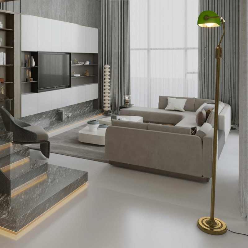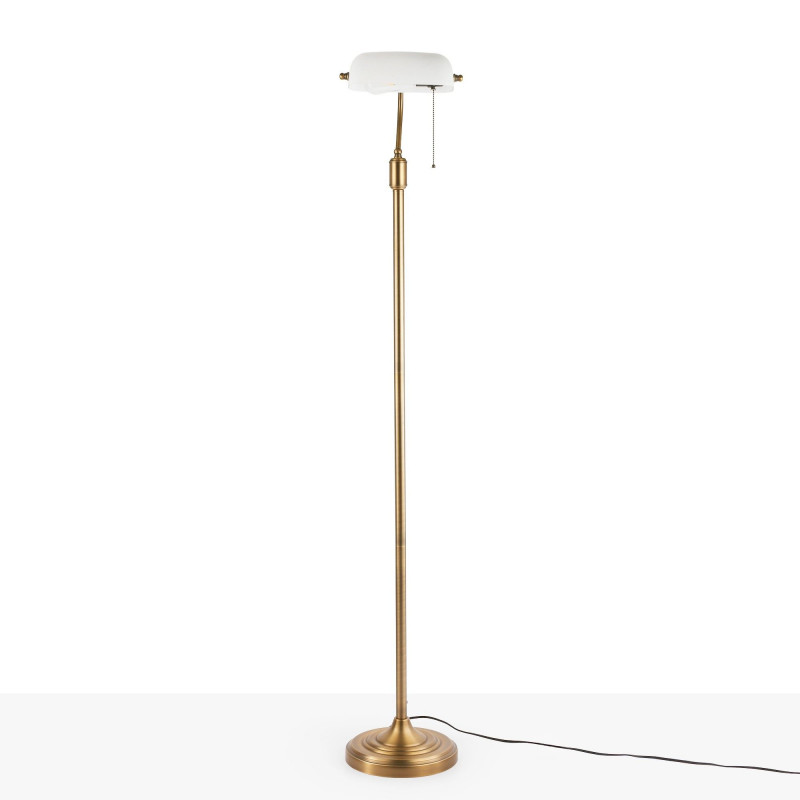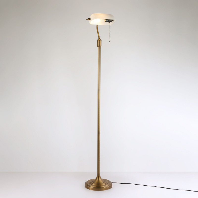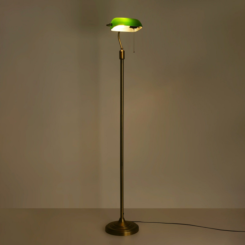 La lámpara de pie BANQUERO, un verdadero icono del diseño clásico, se hizo popular a principios del siglo XX, especialmente en oficinas bancarias, gracias a su elegante diseño y su distintiva pantalla verde.