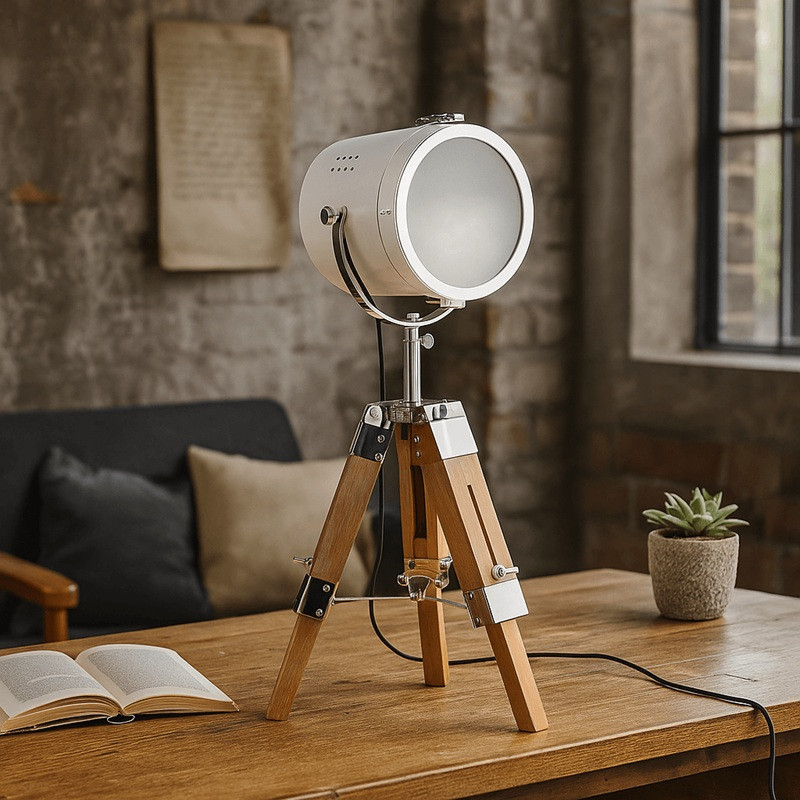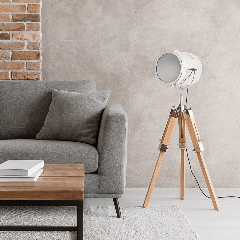 La lámpara BOGART es una pieza funcional y decorativa. Su diseño en cromo brillante, con trípode de madera y cabezal orientable tipo faro, añade un toque distintivo a cualquier ambiente.