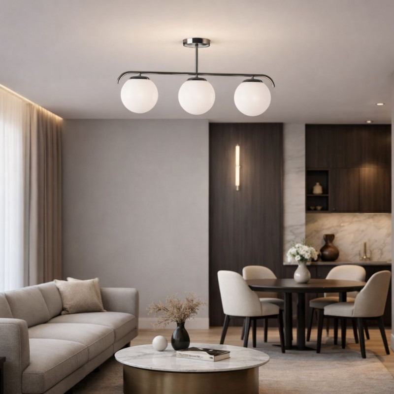 La lámpara de techo "Talí" dispone de una estructura de metal unida a un florón central y tres pantallas esféricas de cristal opalino de alta transmitancia lumínica, capaces de brindar una iluminación brillante y homogénea.