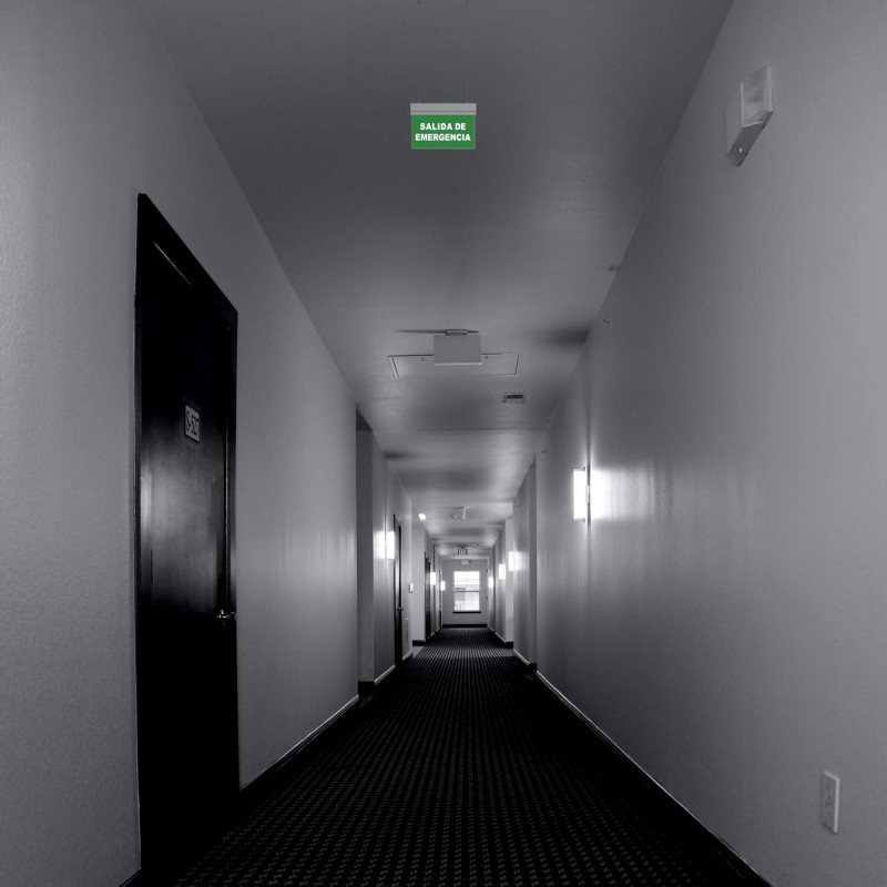 Luz de emergencia permanente con cartel "Salida de Emergencia" - Suspensión