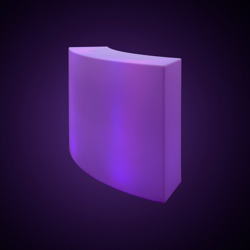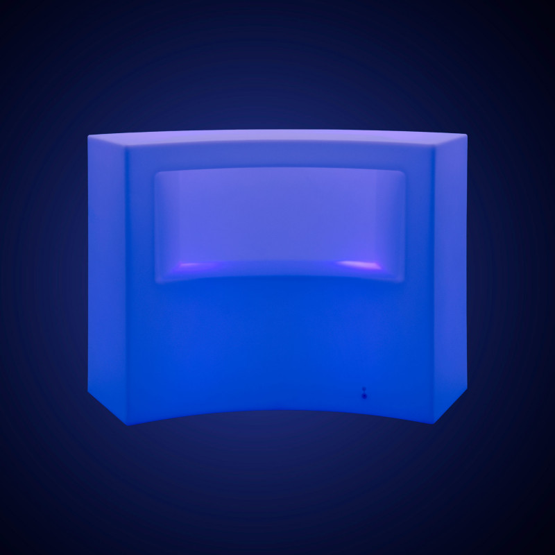 Mostrador curvo LED de exterior con 2 focos de 5W cada uno. Personaliza la iluminación con colores RGBW y efectos de cambio de color, adaptándolo a cada ocasión.