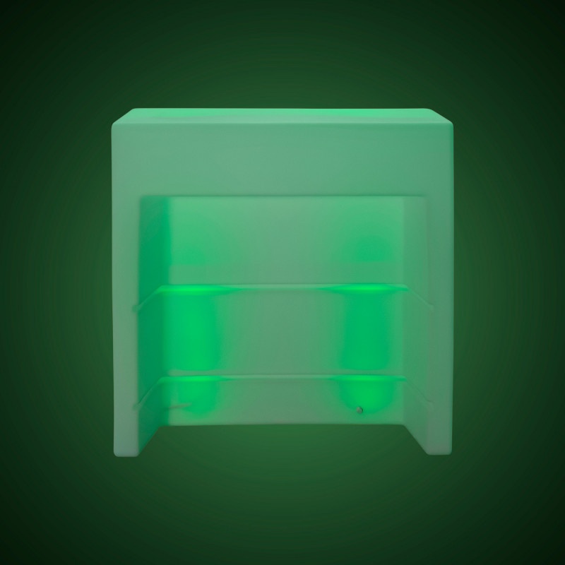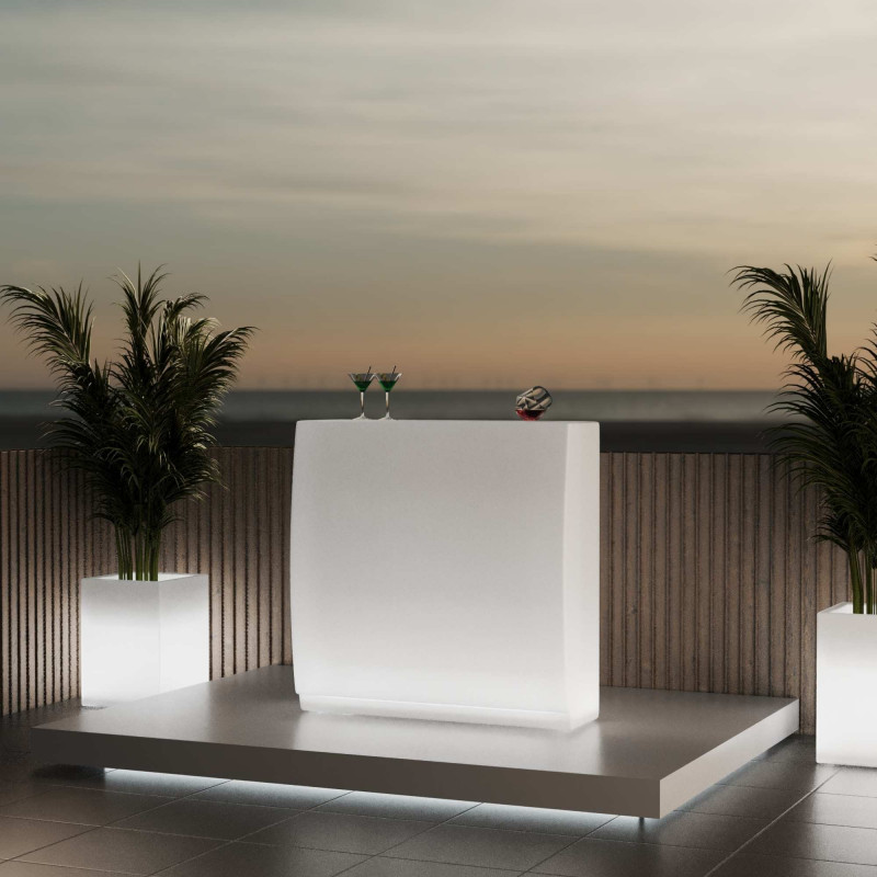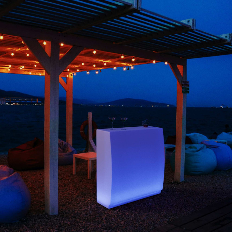 Mueble luminoso LED de exterior que aporta un toque moderno y vibrante. Personaliza la iluminación con colores RGBW y efectos de cambio de color, adaptándolo a cada ocasión.
