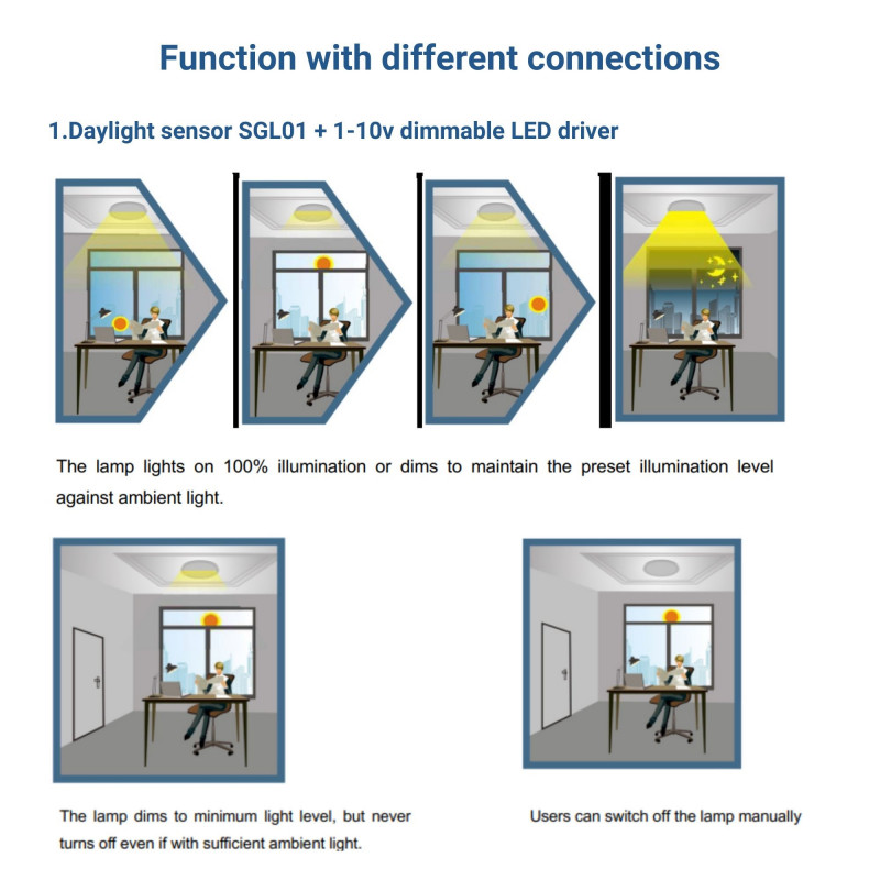 De foto-elektrische sensor is compatibel met dimbare drivers en 1-10V voedingen of armaturen die 1-10V dimmen ondersteunen. Hij heeft een detectiegebied van 360º en het dimbereik is 1-100%.