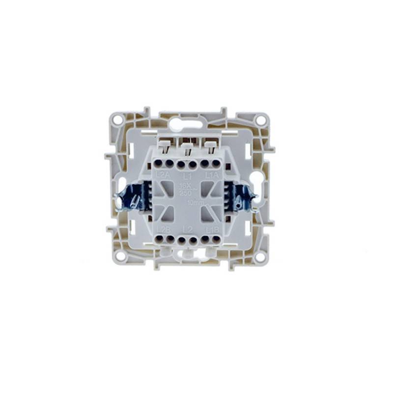 Mechanisme met schakelfunctie bestaande uit twee delen (stuurt twee onafhankelijke circuits aan), niet geschakeld. De tweedelige schakelaar is ontworpen voor inbouw in universele standaarddozen. De kabels worden bevestigd met schroefloze snelklemmen.