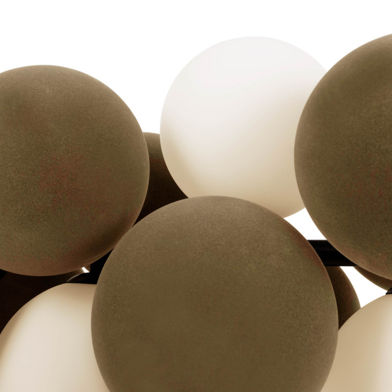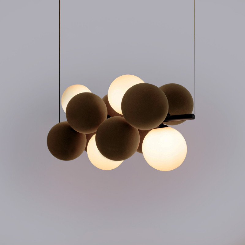 Geïnspireerd door de essentie van het abstracte, presenteert dit stuk een horizontaal ontwerp, bestaande uit 12 bollen van Ø140mm elk: 4 lichtgevende bollen (G9 lampen) in opaal glas en 8 absorbers bedekt met een akoestische textielhoes, verkrijgbaarin grijs of bruin .