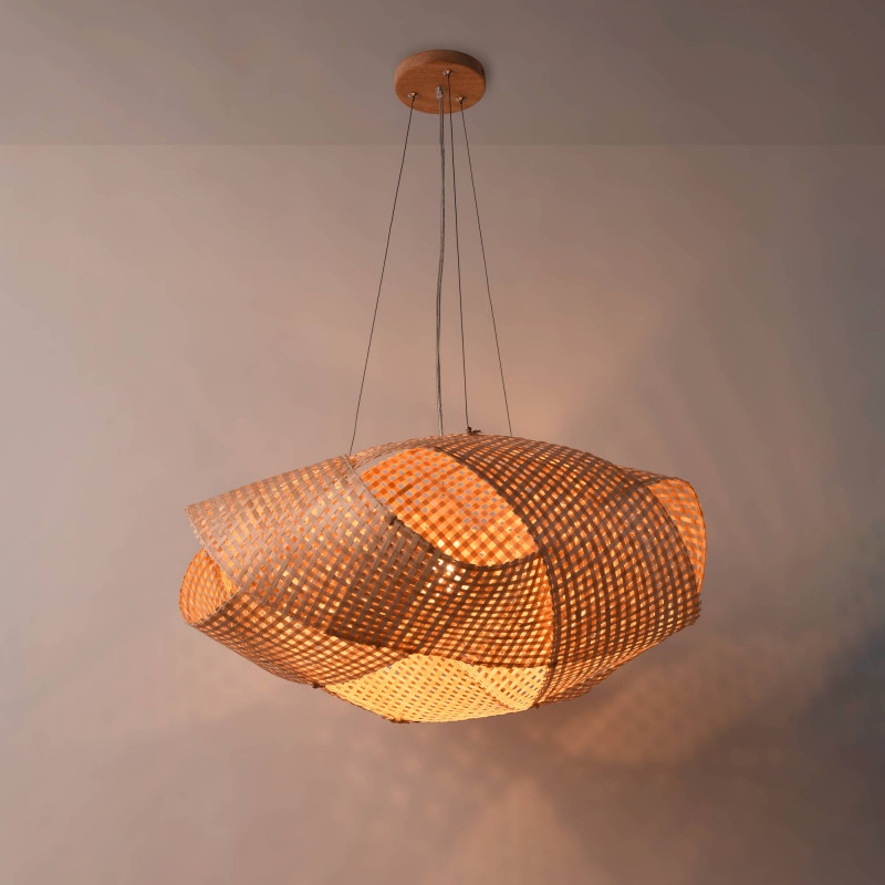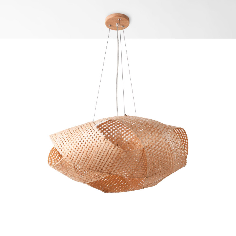 Deze lamp betovert met haar vloeiende en organische ontwerp, handgeweven in natuurlijke rieten vezels.