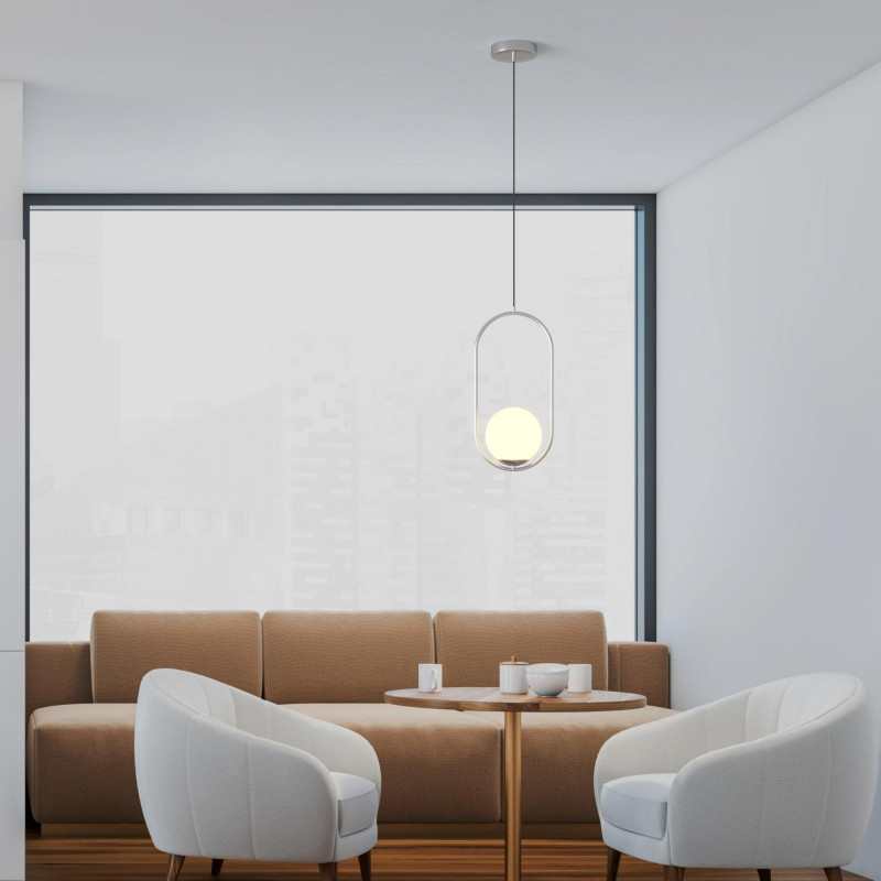 - Minimalistisch ontwerp: Met een opalen glazen bol die aan een aluminium structuur in goud of chroom hangt, past deze lamp perfect bij verschillende decoratieve stijlen.