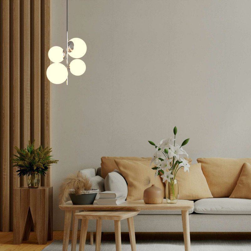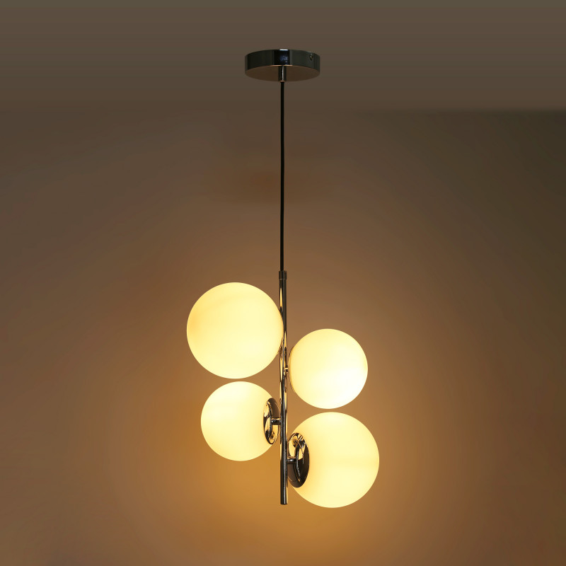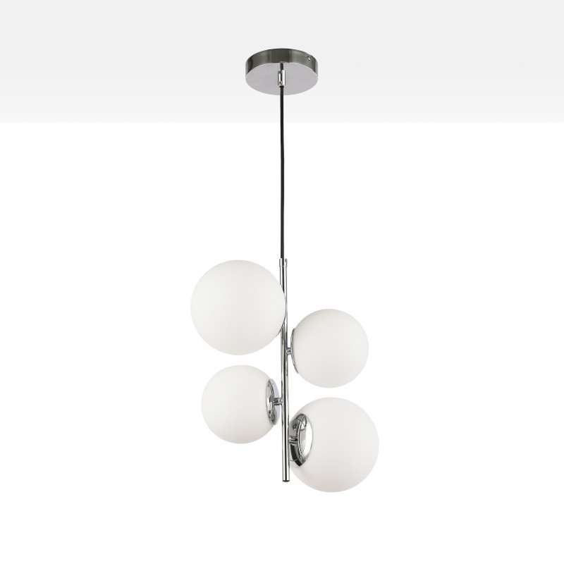 - Minimalistisch ontwerp: Met 4 opalen glazen bollen en een aluminium structuur in goud- of chroomafwerking is deze lamp een perfecte aanvulling voor interieurs met verschillende decoratieve stijlen.