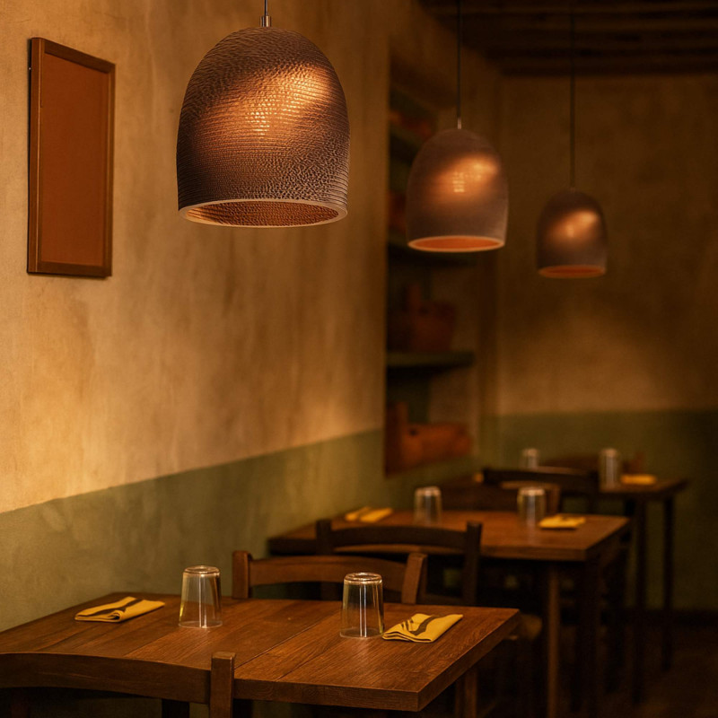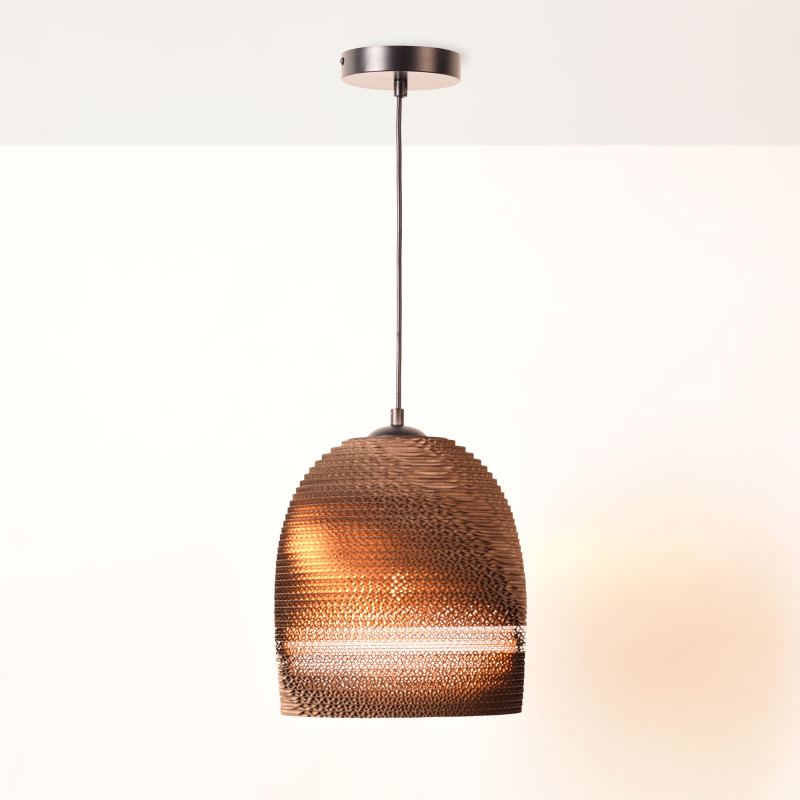 - Ecologisch materiaal: Kap gemaakt van golfkarton, een duurzaam en recyclebaar materiaal dat lichtheid en duurzaamheid biedt.