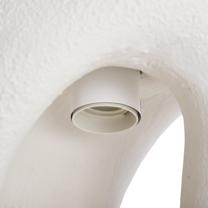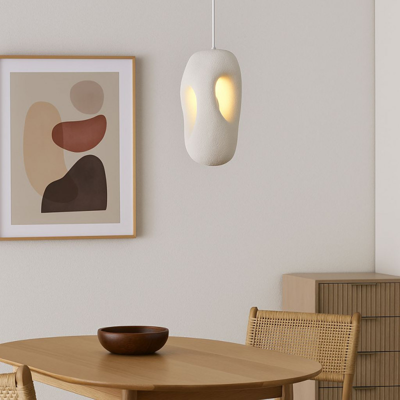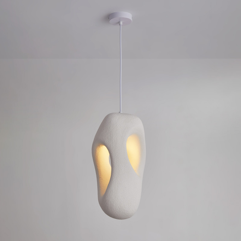 Hanglamp gemaakt van hars met een witte afwerking. De onregelmatige structuur met openingen genereert een zachte en omhullende verlichting.