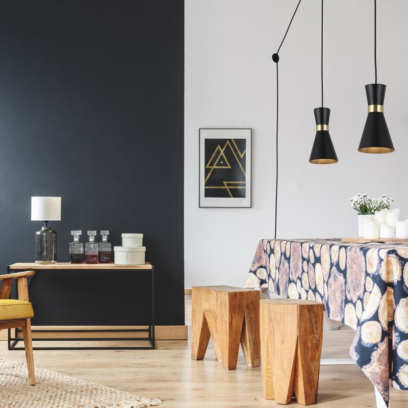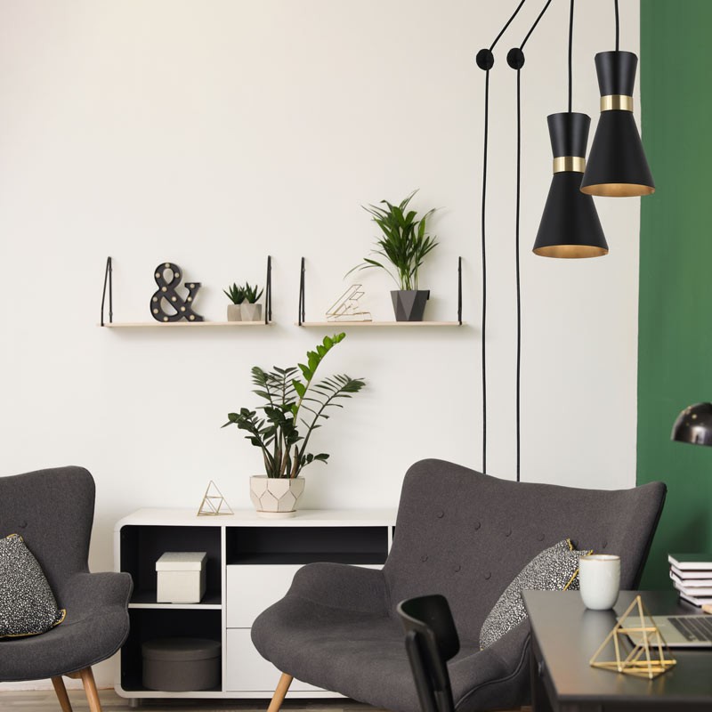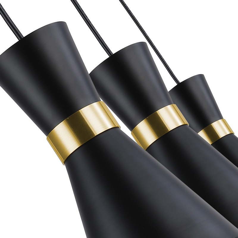 De hanglamp "Mir" heeft een modern ontwerp met een elegante aluminium structuur met een matte afwerking en gouden details die voor een aangenaam contrast zorgen.