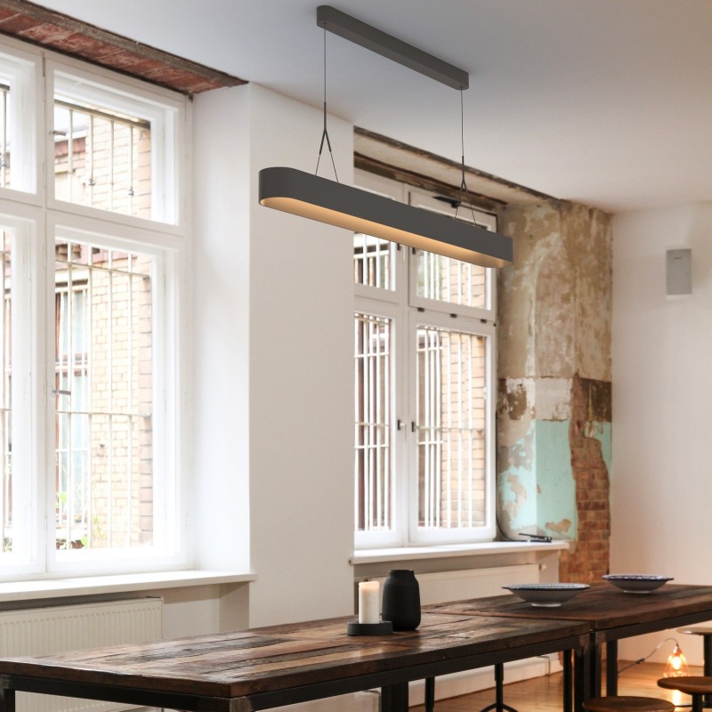 De hanglamp "Ripley" heeft een modern ontwerp, met eenvoudige lijnen die distinctie en soberheid in de omgeving brengen.