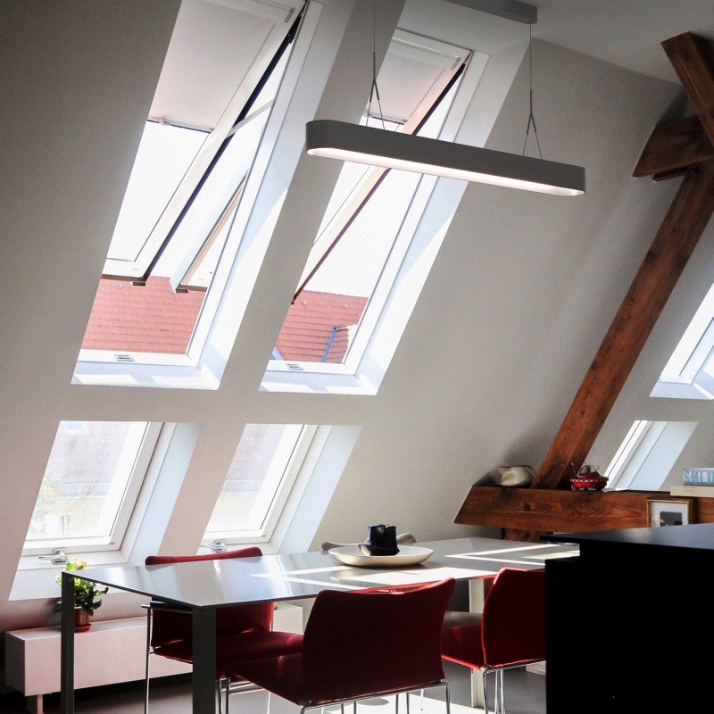 Hij valt vooral op in grote omgevingen of wanneer hij aan hoge plafonds hangt, omdat hij in hoogte verstelbaar is tot 1,3 m.
