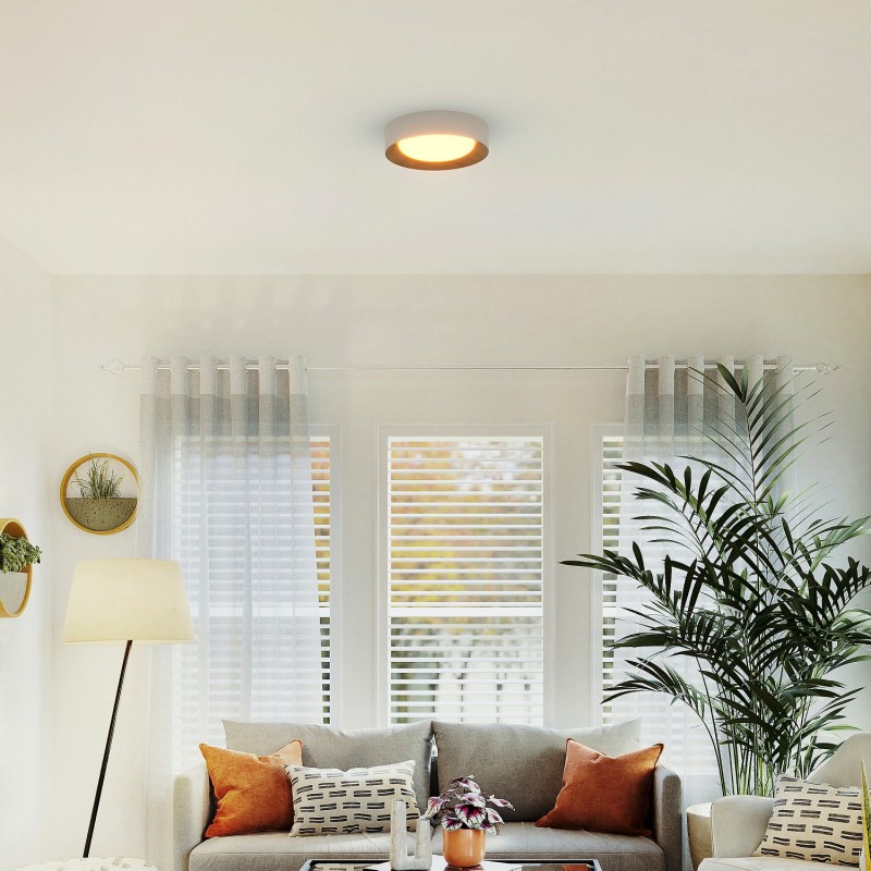 LED plafondlamp bestaande uit een witte aluminium structuur met een houtkleurige binnenkant met een diameter van 45 cm en een centrale diffuser van polycarbonaat. Het ontwerp is modern en elegant, in lijn met de laatste decoratieve trends.
