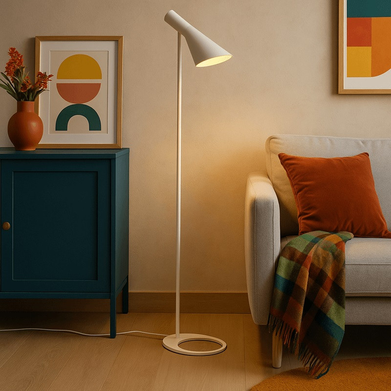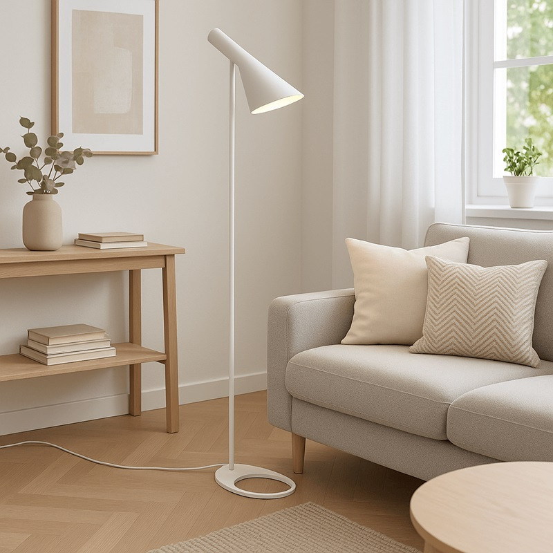 De "Marlene" vloerlamp is geïnspireerd op een klassieke lamp uit de jaren 1950. Ze heeft een uniek ontwerp met rechte, eenvoudige lijnen die perfect passen bij minimalistische decoratiestijlen.