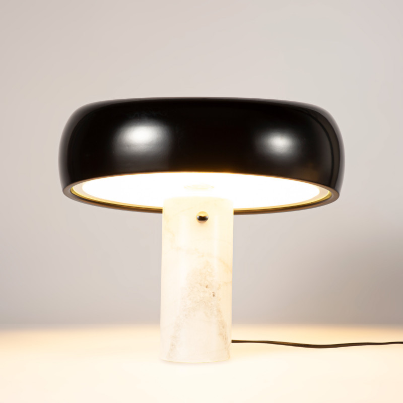 - Hoogwaardige materialen: Gelakte metalen kap, diffuser met glazen bodem en wit marmeren voet voor uitzonderlijke duurzaamheid en elegantie.
