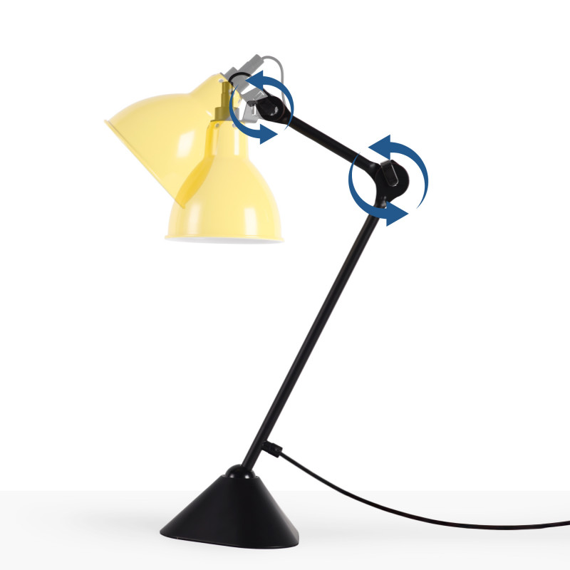 - Scharnierend formaat: De lamp heeft een vaste voet en een scharnierende arm met een verstelpunt waarmee de onderdelen en de kap kunnen worden gekanteld. De kap is 360° draaibaar.