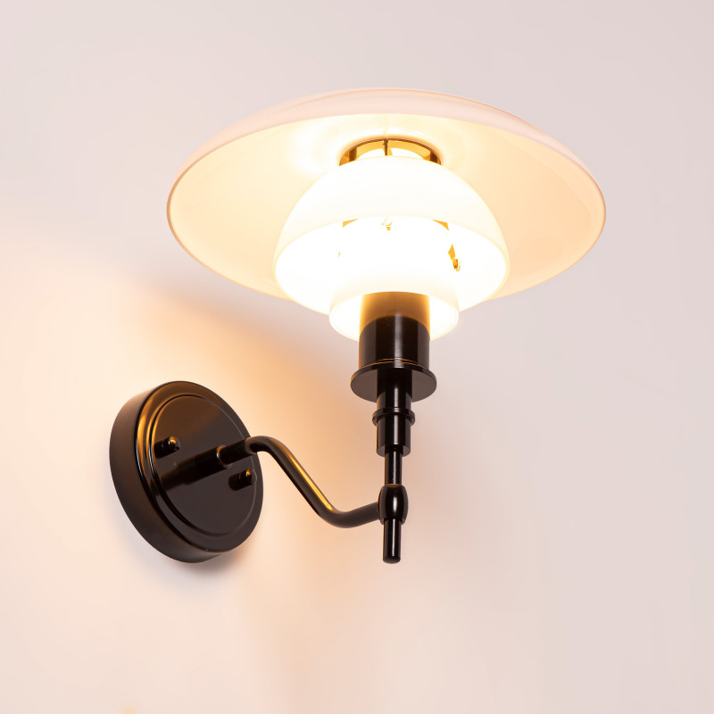 Prachtig ontworpen wandlamp met drievoudig opaal glazen kap en aluminium voet.