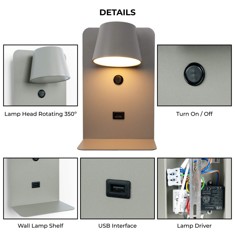 Set x 2 - Wandleeslamp met USB-poort "BASKOP" - 6W - Rechtopstaand ontwerp - Grijs