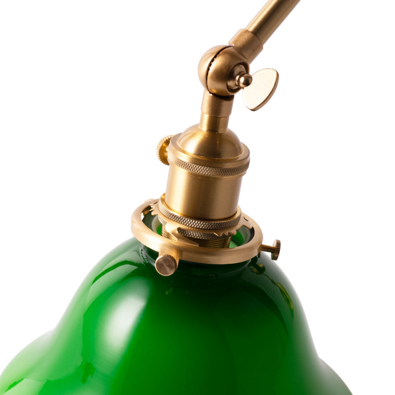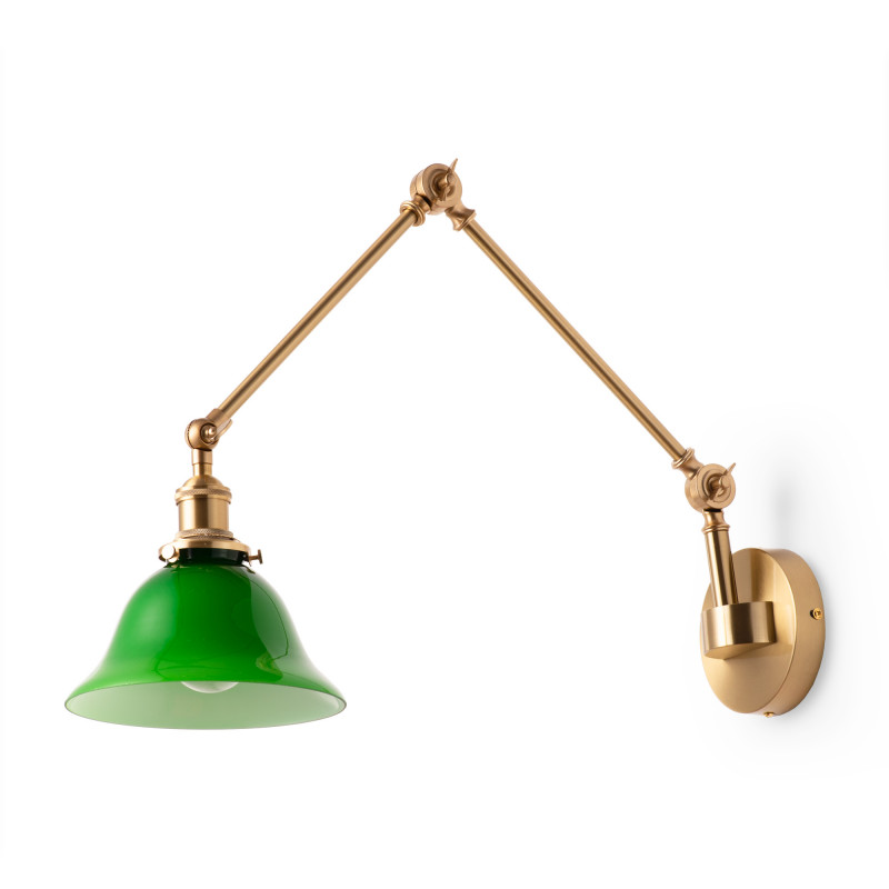 - Ontwerp: Aluminium structuur met een verouderde gouden afwerking die de vintage industriële stijl versterkt. Groene glazen kap.