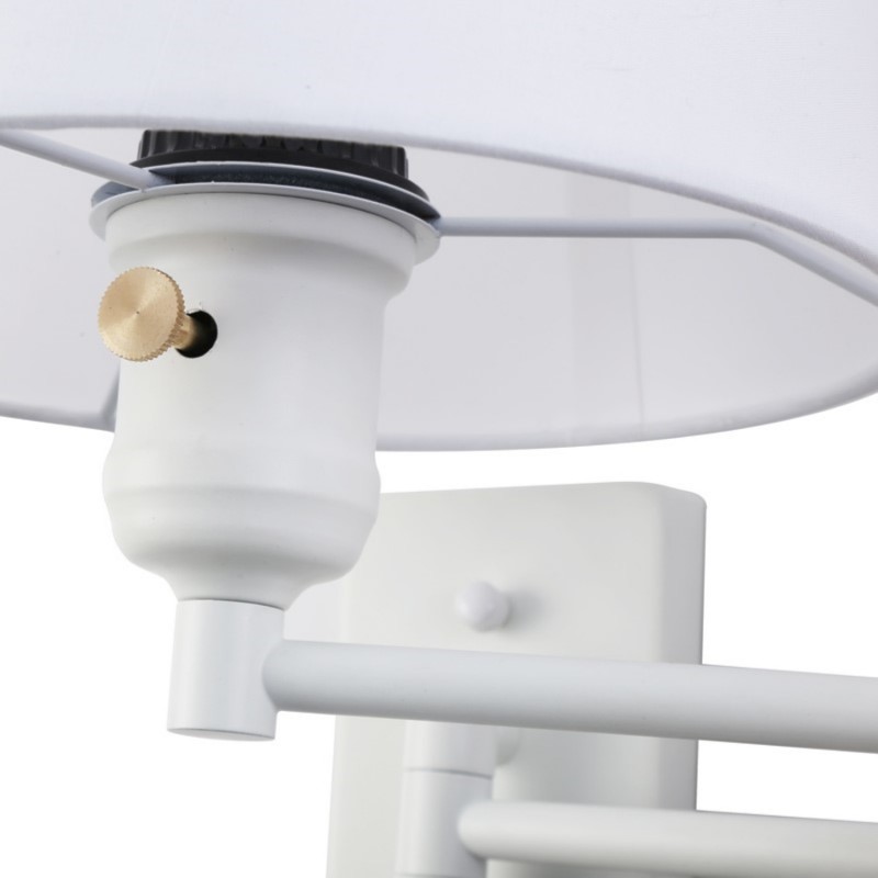 Wandlamp met een klassiek en verfijnd ontwerp, met een esthetiek die zich aanpast aan elk interieur. De lamp heeft een stoffen kap in wit, die een diffuse en gezellige verlichting biedt, en een aluminium structuur die verkrijgbaar is in 4 kleuren.