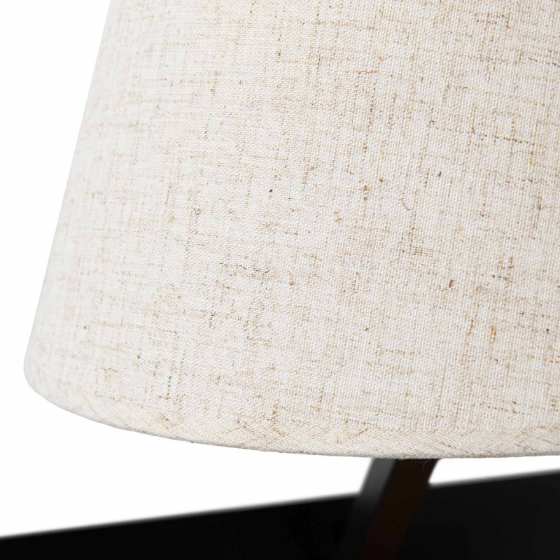 De lamp heeft een wit gelakte aluminium voet, een elegante beige stoffen kap en een natuurlijke houten plank.