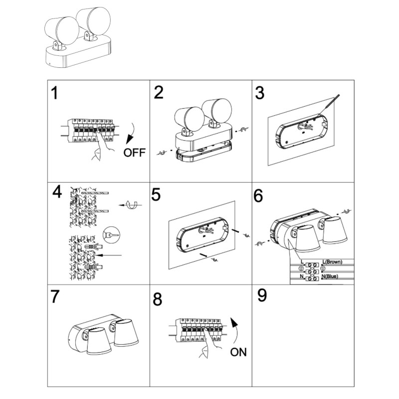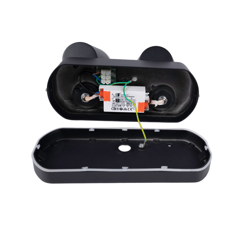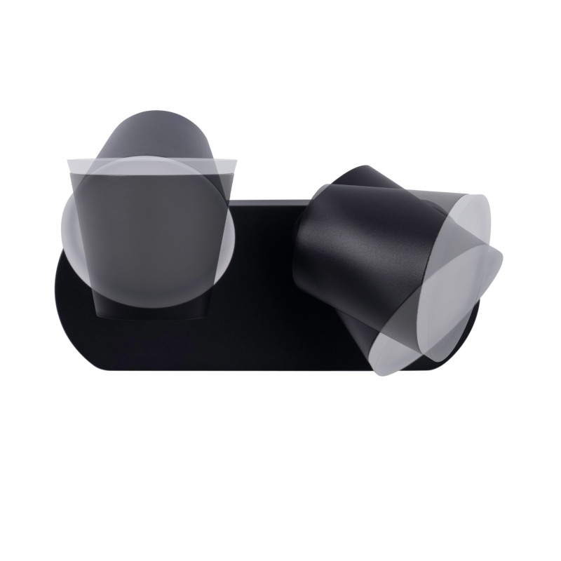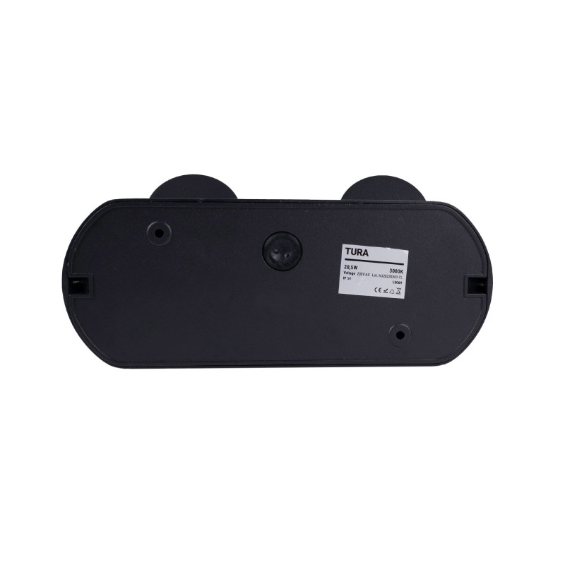 De LED-buitenwandlamp "Tura" heeft twee aluminium kappen in een matzwarte afwerking die verstelbaar zijn naargelang de behoeften van elke ruimte. Bovendien heeft elke kap een opalen polycarbonaat diffuser die het licht op een zachte en homogene manier verspreidt.