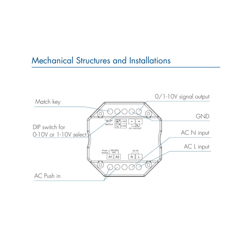 - Geavanceerd dimmen: 0-100% dimmen met 256 niveaus van zachtheid en 3s aan/uit overgang. 0-10V of 1-10V modusselectie afhankelijk van de gebruikte driver.