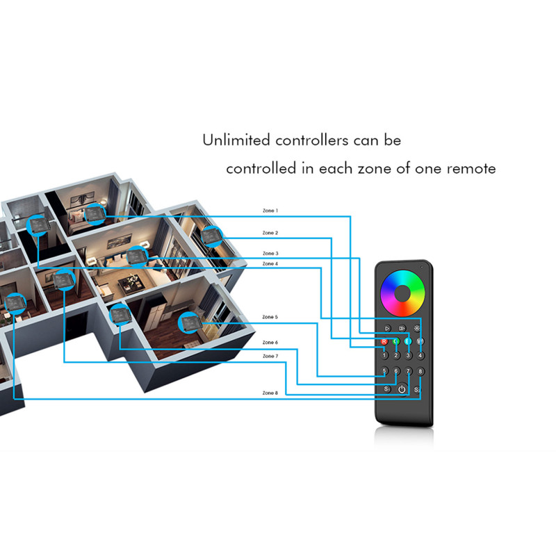 - Afstandsbediening: Compatibel met Skydance 2,4GHz RF-afstandsbedieningen voor enkele kleur, CCT, RGB/RGBW. Regel de verlichting overal vandaan met hand-, wand- of smartphoneafstandsbedieningen (door een Wi-Fi-gateway toe te voegen).
