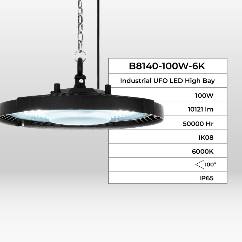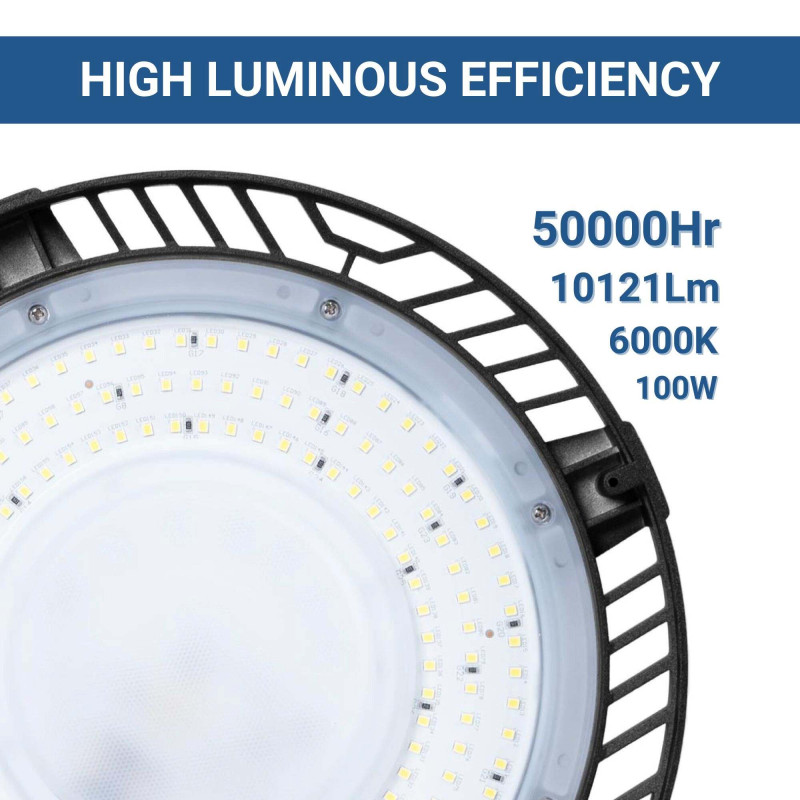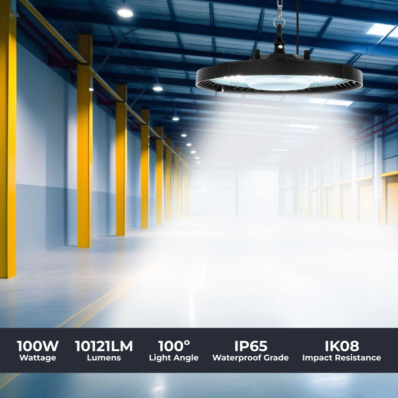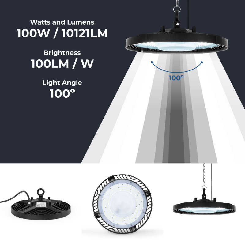 - Hoog lichtrendement: Met een vermogen van 100W en een hoog rendement van 100 lm/W verlicht deze LED-kap niet alleen grote oppervlakken, maar optimaliseert hij ook het energieverbruik. Hij biedt verlichting onder een brede hoek van 100°.