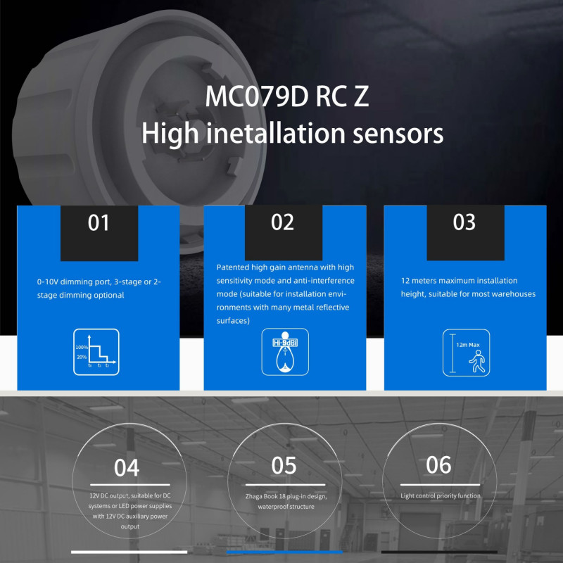 - Zeer gevoelige bewegingssensor: Deze sensor is speciaal ontworpen voor industriële omgevingen en magazijnen en heeft een detectiehoek van 150° (wandmontage) en 360° (plafondmontage), waardoor een efficiënte verlichtingsregeling mogelijk is. Bovendien kunnen detectieparameters zoals uitschakeltijd en stand-by periode worden aangepast met een compatibele afstandsbediening (niet meegeleverd, zie gerelateerde producten).