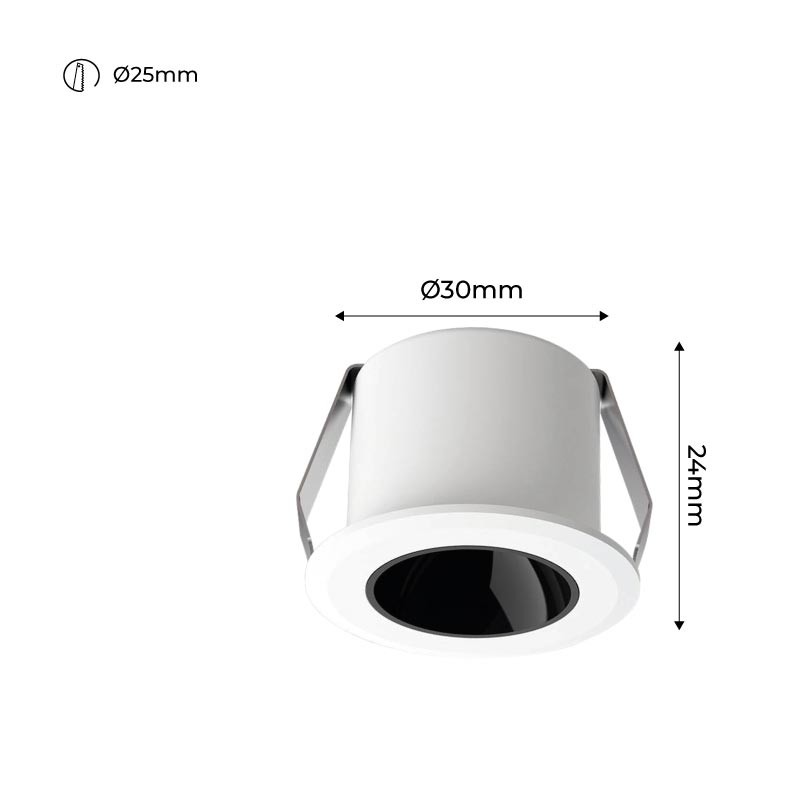 De inbouwdownlight heeft afmetingen van Ø30x24mm. De snijdiameter is Ø25mm.