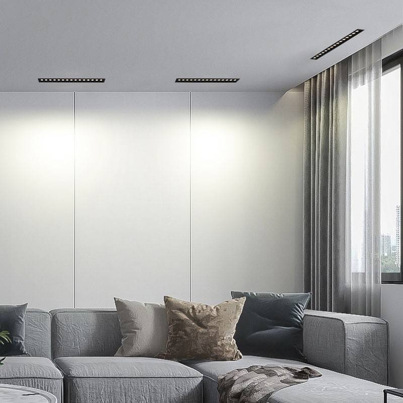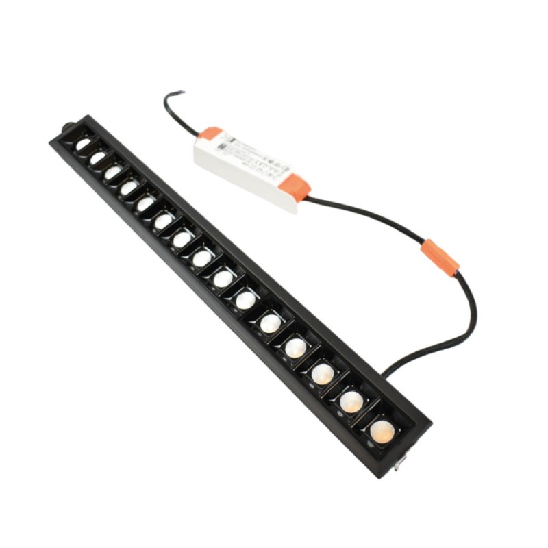 LED inbouwspots met een modern design en compacte afmetingen, 415x45mm, zeer discreet na installatie. Met 15 LED downlights ideaal voor het creëren van sfeervolle en gerichte LED verlichting. Hoge kleurweergave CRI (CRI >90), hoe hoger de CRI hoe beter de kleurdefinitie. Met zijn kleine afmetingen kan hij grote oppervlakken verlichten met een lichthoek tot 45 graden. Dankzij het moderne en minimalistische ontwerp kan hij eenvoudig worden aangepast aan elke stijl en in het plafond worden geïntegreerd. De afsnijddiameter is 407 x 37 mm.