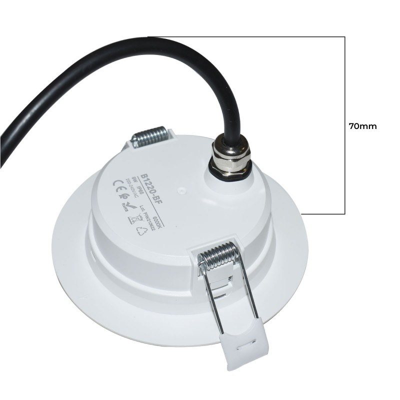 Waterdichte LED inbouwdownlight met 8W vermogen en ingebouwde driver, waarmee directe aansluiting op 220-240V/AC mogelijk is. Aansluiten op het lichtnet is eenvoudig, door fase en nul aan de achterkant vast te schroeven en de aansluitingen af te dekken met de meegeleverde afdekking. De schroef en moer aan de achterkant voorkomen dat er vocht in het elektrische systeem komt.