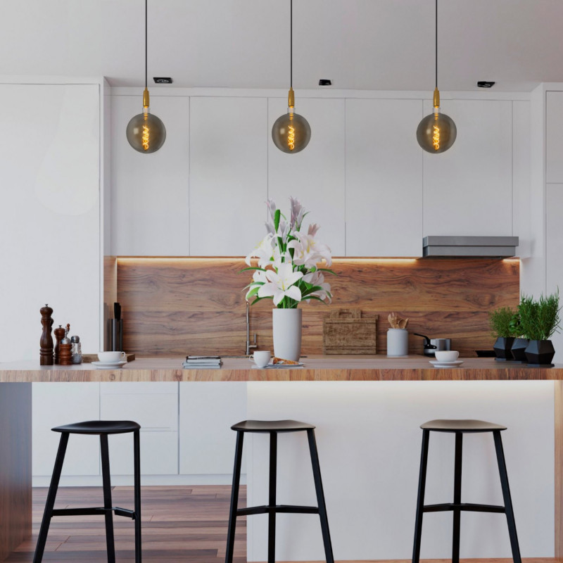 De blootliggende gloeidraad versterkt de vintage charme en werpt een warm en zacht licht, terwijl de rokerige tint van het glas de lamp een mysterieuze en elegante uitstraling geeft.