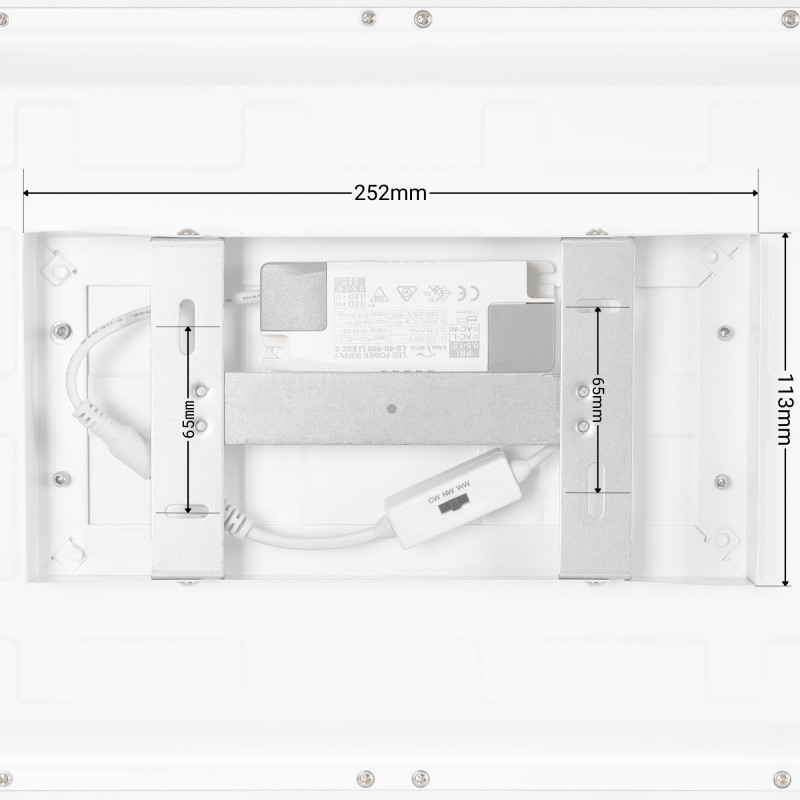 - Instelbare tint: CCT-systeem voor aanpassing van de kleurtemperatuur tussen: warm wit (3000K), neutraal wit (4000K) en koel wit (6500K). De bediening gebeurt met een schakelaar die in het paneel is geïntegreerd.