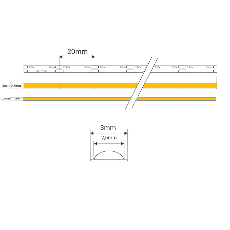 LED strip COB monocolor - 24V DC - 8W/m - 3mm - 400 LED/m - IP20 - 5 meter