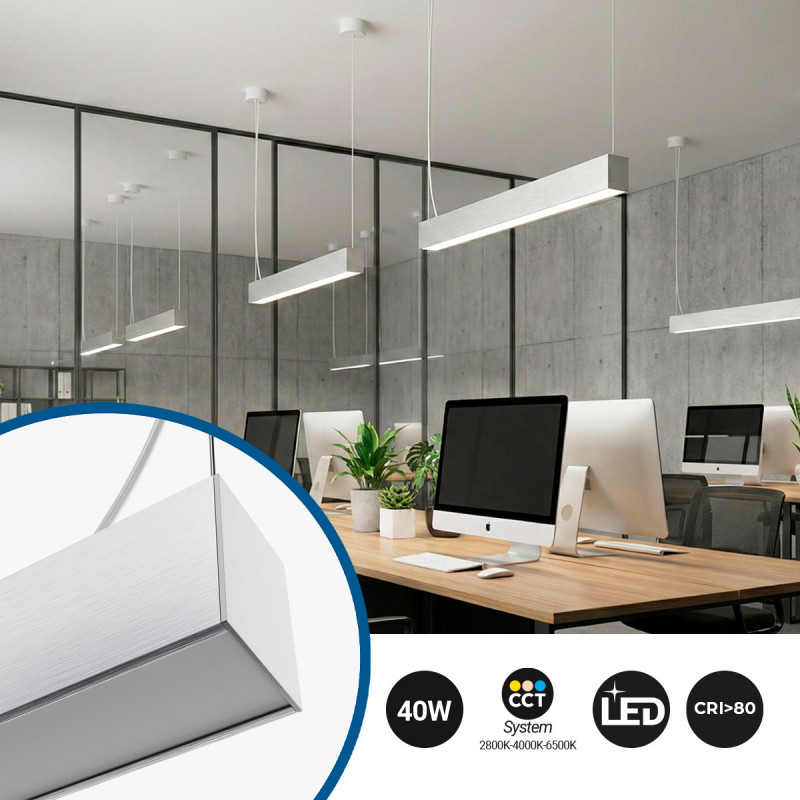 Lineaire LED pendelarmatuur met een modern ontwerp, ideaal voor kantoren, winkels en werkruimten die professionele, efficiënte verlichting met een hoog visueel comfort nodig hebben.